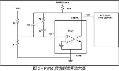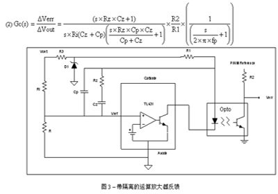 在设计包含PWM而不含电压放大器的电源设计时,系统设计人员可采用并联稳压器作为廉价的运算放大器。图2给出了这种应用的功能结构图。方程式1解释了这种补偿网络的小信号传输函数的数学原理。  我们可向电路添加光耦合器,以实现一定程度的电隔离(galvanic isolation)。图3给出了隔离的反馈电路的示意图。电阻器R1用于向光耦合器及TL431施加偏压。电阻器R3和二极管D1提供一个固定的偏置,以保证偏压电阻R1不会形成反馈路径。电阻器R1和R2用于控制整个光耦合器上的增益。在大多数设计中,R2与R1之比大致设置为十比一。光耦合器带有高极点频率(fp)。光耦合器的产品说明书一般不提供有关极点频率的信息。通过采用网络分析仪,我们会发现许多应用中的极点约为10kHz。